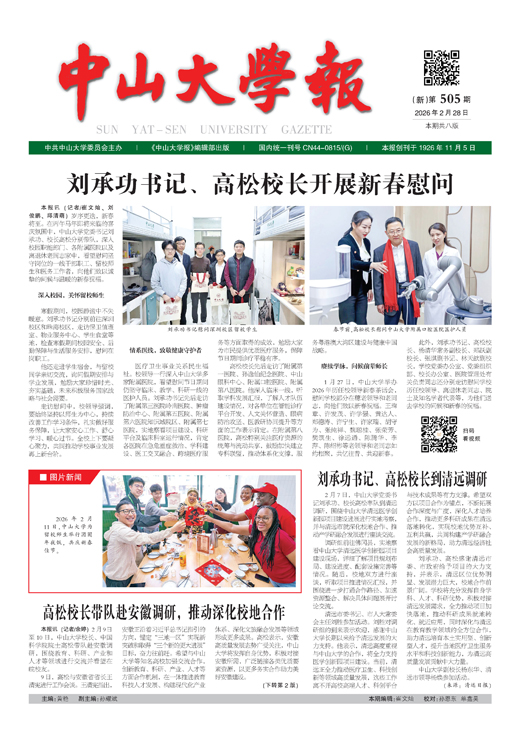本报讯(记者/崔文灿、刘俊鹏、邱清萌)岁序更迭,新春将至。在丙午马年即将来临的喜庆氛围中,中山大学党委书记刘承功、校长高松分别带队,深入校园职能部门、各附属医院以及离退休老同志家中,看望慰问坚守岗位的一线干部职工、留校师生和医务工作者,向他...