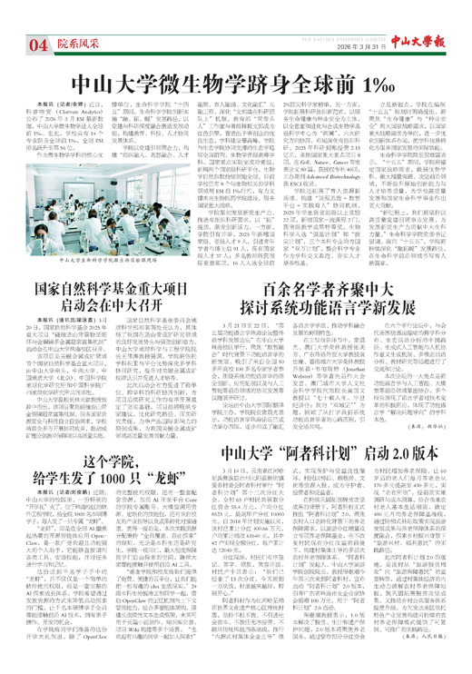 本报讯(记者/余婷)近日,科睿唯安(Clarivate Analytics)公布了2026年3月ESI最新数据,中山大学微生物学进入全球前1‰。至此,学校共有14个专业跻身全球前1‰,全球ESI排名跃升至第56位。作为微生物学学科的核心支撑...