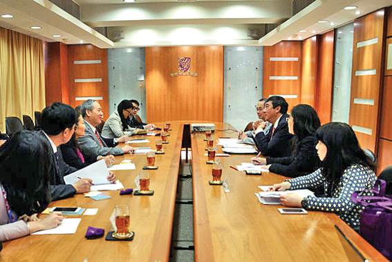 在香港礼宾府,罗俊一行拜会了香港特区政府行政长官梁振英,就教育、人才培养,更好地保持香港特区繁荣稳定,促进粤港融合发展等问题进行了洽谈。