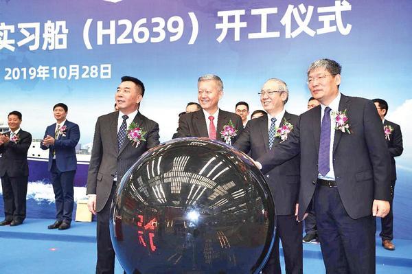 本报讯(南海研究院、党委宣传部 摄影/李劲峰、阮瑞旻)10月28日上午,我校海洋综合科考实习船(以下简称“中大科考船”)开工仪式在上海长兴岛江南造船(集团)有限责任公司(以下简称“江南造船”)举行。我校党委书记陈春声、校长罗俊院士、常务副校长孙冬柏,南方海洋科学与工程实验室主任陈大可院士,江南造船党委书记、董事长林鸥,江南造船总经理、党委副书记黄文飞,中国船级社上海分社副总经理徐立,七〇八研究所党委书记卢霖,上海佳船工程监理发展有限公司负责人,以及我校有关职能部门、涉海院系负责人和科考船建设指挥部成员等60多人出席开工仪式。江南造船副总经理林青山主持仪式。