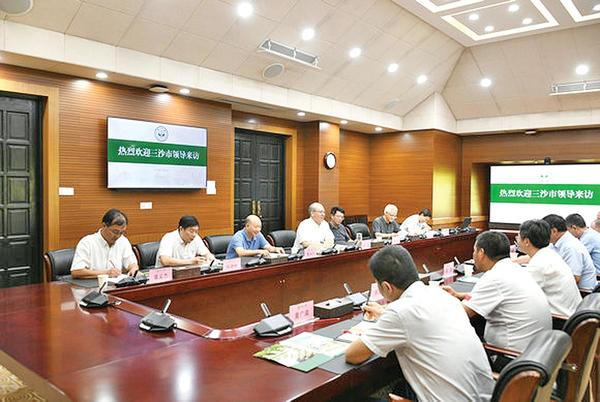 本报讯(记者/吴立坚)7月28日上午,我校与三沙市召开合作座谈会,三沙市委书记张军、市长邓忠,校长罗俊,中国科学院院士陈大可、戴永久,大气科学学院院长董文杰参加座谈。党委常务副书记、副校长马骏主持座谈会。