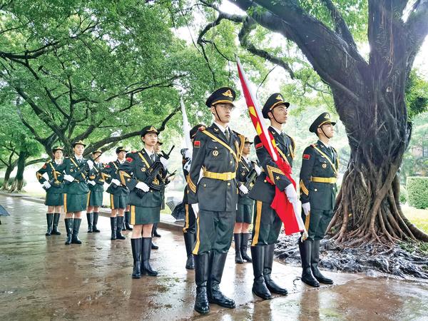 早晨8时许,国旗班的成员们精神抖擞地在仪式现场就位等待。他们目光如炬,流露出心系家国的拳拳赤子心。他们身姿挺拔如松,展现出中大莘莘学子守卫国旗的坚定信念与决心。