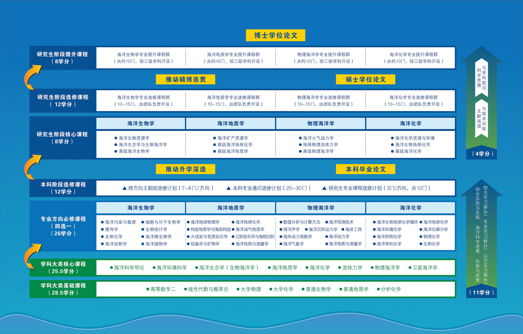 学院以培养未来研究海洋的科学家为目标,按照“一级学科培养本科生;二级学科培养硕士生;三级学科培养博士生”的思路,构建了海洋科学专业“本-硕-博”一体化课程体系,较为系统地解决了本科、硕士、博士各学段课程之间的衔接问题,实现了本科、硕士、博士三个培养层次的贯通培养,立足于第一课堂主阵地,为营造升学氛围并推动本科生继续深造奠定了坚实基础。