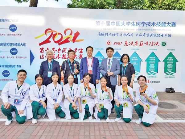 本报讯(记者/吴立坚)5月16日,有着中国医学生“奥林匹克”之称的第十届中国大学生医学技术技能大赛在天津落下帷幕,我校医科学子表现异常抢眼。在全国总决赛中,夺得临床医学专业八年制赛道金奖、临床医学专业五年制赛道银奖和预防医学专业赛道铜奖。这是学校继2011到2014年夺得此项比赛“四连冠”后的最好成绩。我校常务副校长肖海鹏在此次大赛中担任了临床医学专业八年制赛道裁判长,并获得了大赛贡献奖。