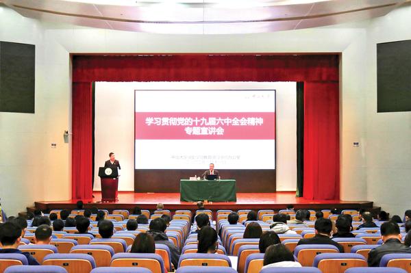 梁道刚教授作题为《党的十九届六中全会精神解读》的宣讲报告。报告系统介绍了《决议》制定的时代背景,充分阐释了为了实现中华民族伟大复兴,中国共产党团结带领中国人民,在四个历史时期取得的重大历史成就,深入分析了习近平新时代中国特色社会主义思想如何实现了马克思主义中国化新的飞跃,重点解读了“两个确立”的重大理论意义和实践要求,以及党的百年奋斗取得的重大成就和历史经验。