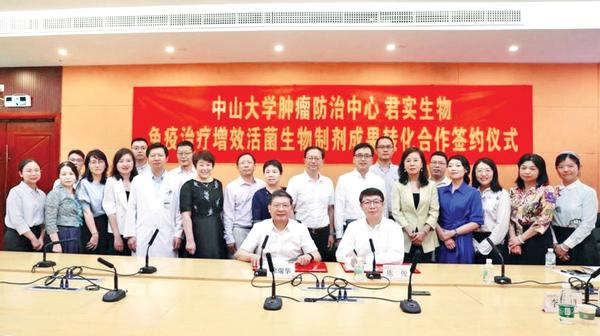 本报讯(通讯员/陈鋆、赵现廷、郑敏珊) 8月11日,中山大学肿瘤防治中心徐瑞华教授团队与上海君实生物医药科技股份有限公司在广州就“免疫治疗增效活菌生物制剂”项目签署转化协议。双方将加强产学研合作,充分发挥各自优势,加快推进免疫治疗活菌增效剂的研发上市,为晚期肿瘤患者带来新的希望。