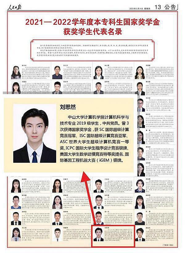 本报讯(通讯员/林仪)5月4日,人民日报发布《2021—2022学年度本专科生国家奖学金获奖学生代表名录》(以下简称《名录》),我校刘思然同学名列其中。