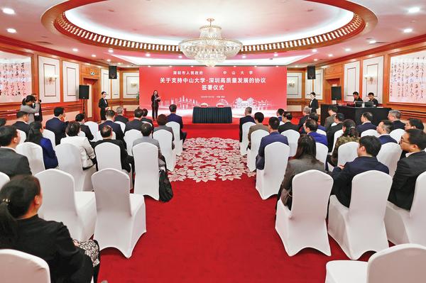 本报讯(记者/张妍 摄影/肖遥)1月31日,我校与深圳市政府在深圳签署《关于支持中山大学·深圳高质量发展的协议》,双方将在前期卓有成效的合作基础上,进一步在人才培养、人才引进、一流学科建设、科技项目与科技平台创新、附属医院建设发展等方面加强合作,加快推进深圳校区高质量发展。中山大学党委书记陈春声,中山大学校长高松,深圳市市相关领导出席活动并见证签约。中山大学常务副校长杨清华,深圳市副市长陈清代表合作双方签署协议。