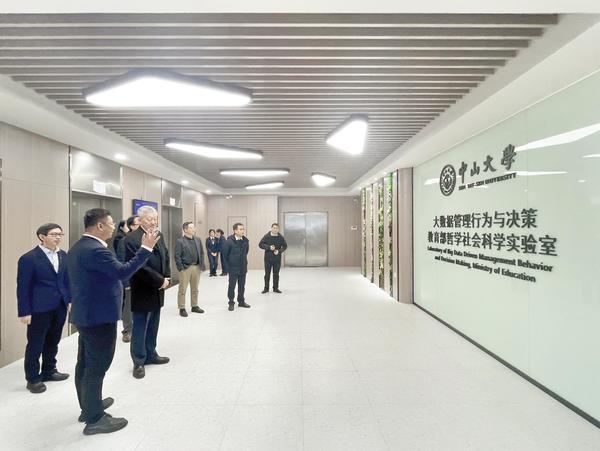 在中山大学大数据管理行为与决策教育部哲学社会科学实验室,陈春声书记听取了管理学院韦立坚副教授关于实验室建设及运营情况报告。中山大学大数据管理行为与决策教育部哲学社会科学实验室是2021年底获得教育部批准立项的国家级研究平台,依托中山大学管理学院及国家超算广州中心进行建设。该实验室将大数据和人工智能等技术与工商管理学科深度融合起来,旨在解决企业高质量发展与经济安全风险等重大现实问题。实验室面积3600平米,配置了数据驾驶舱、智慧决策剧场、智能供应链管理平台、人智交互机器人等专业设备,建成超算大数据平台,配备隐私计算、人工智能、计算实验和区块链等软件系统。陈春声书记听取了讲解,并就实验室服务经济社会发展的相关情况与韦立坚副教授展开交流研讨。