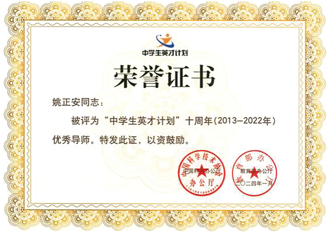 本报讯(通讯员/朱珈奇)新学期伊始,数学学院姚正安教授获评由中国科协办公厅和教育部办公厅共同颁发的“‘中学生英才计划’十周年(2013-2022年)优秀导师”荣誉称号。