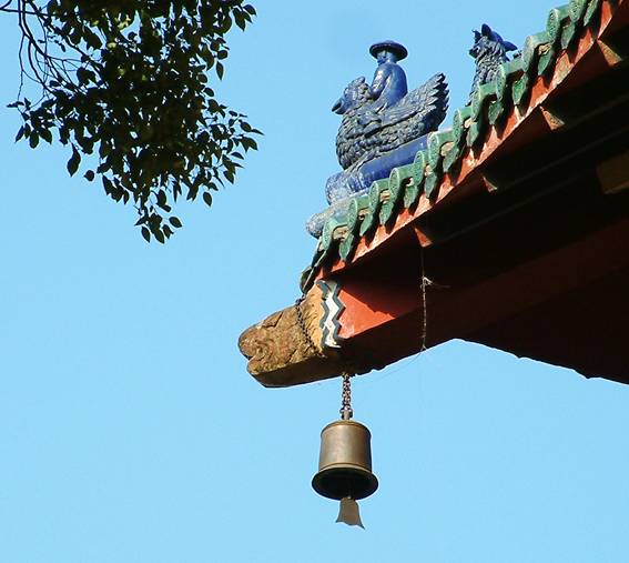 上层奢华的中式大屋顶,是中国人司空见惯的斗拱构造。屋顶垂脊和戗脊也饰以人兽等像,但有别于传统的是,最前端带路的仙人是个骑着公鸡的年轻人,这或许是外国建筑师对凤凰这一中国文化中特有的形象不知晓的缘故吧。第二层红柱贯穿至顶,在西方建筑中叫巨柱式,比例很接近西方古典建筑,而中国传统为每层柱子彼此独立的叠柱式。
