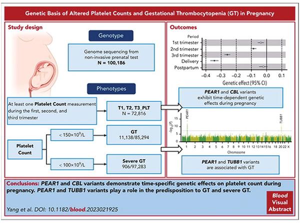 本报讯(通讯员/刘斯洋)2024年4月11日,中山大学公共卫生学院(深圳)刘斯洋副教授团队联合深圳市龙岗区妇幼保健院与深圳市宝安区妇幼保健院,在Blood期刊上发表了题为“Genetic basis of pregnancy-associated decreased platelet counts and gestational thrombocytopenia”的研究论文,首次揭示了妊娠期血小板计数的变化和GT的遗传基础。