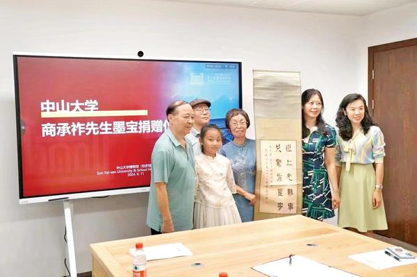 今年,是中山大学建校100周年的重要节点之年。6月11日上午,黄女士伉俪带着还在上小学的孙女悦桐,专程从南宁到广州,向母校捐赠商老的这件墨宝,捐赠仪式在中山大学新博物馆2A楼会议室举行,其中,有中山大学校友事务办公室和中山大学博物馆的黄瑞敏、邢怡媛、劳楚华、许景明等领导,有从天津、南宁等地专程赶来参加的施宝萍师姐、胡彩芬女士等,吴行赐、阮启尚、陈资长校友及黄女士多位的同班同学。