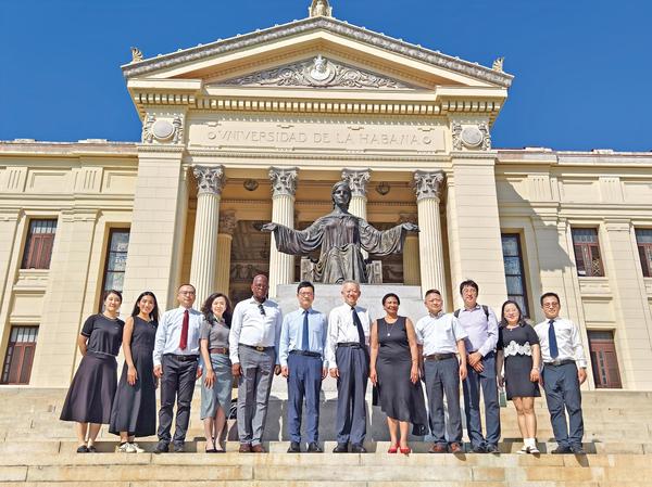 代表团首站访问了古巴哈瓦那大学,与该校校长米里亚姆·尼科多·加西亚(MIRIAM NICADO GARCíA)、常务副校长迪奥尼西奥·扎尔迪瓦尔·席尔瓦(DIONISIO ZALDIVAR SILVA)和相关学院代表进行座谈交流。哈瓦那大学是古巴规模最大历史最悠久的大学,其医学教育和研究方面具有较强优势。陈春声书记介绍了中山大学近年发展的主要情况,以及与拉美和加勒比国家在国别区域研究、援建医学实验室、孔子学院/孔子课堂建设、语言人才培养和援外医疗等层面开展合作交流的情况。会议期间,两校签署了正式校际合作协议,确立未来在医疗卫生、公共管理、农业以及语言学等多领域跨学科的合作意向。