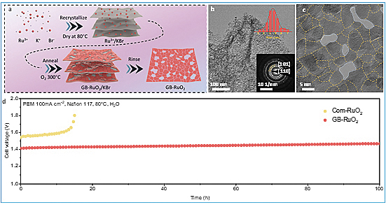 近日,材料科学与工程学院崔浩教授、王成新教授以典型的红金石型二氧化钌为研究对象,提出一种基于晶界工程策略来提升RuO2的酸性OER活性和稳定性的研究思路,通过简单的盐辅助重结晶方法,构建出富含晶界的二氧化钌多孔纳米片(GB-RuO2)。相关成果以“Grain-Boundary-Rich RuO2 Porous Nanosheet for Efficient and Stable Acidic Water Oxidation”为题发表于期刊Angewandte Chemie International Edition。