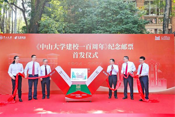 中山大学校长高松、中山大学常务副校长杨清华、中国邮政集团有限公司广东省分公司总经理陈洪涛、广东省邮政管理局副局长罗德韶和《中山大学建校一百周年》邮票设计师张强博士共同为《中山大学建校一百周年》纪念邮票揭幕。