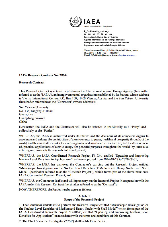 本报讯(通讯员/张一桐、刘梦兰)近日,中法核工程与技术学院核数据学科在国际核领域再次取得重要进展:以袁岑溪教授为首席科学家的科研团队成功获批国际原子能机构(IAEA)研究项目“基于壳模型的中重核区能级密度微观研究”。这是中山大学在核数据领域首次获得IAEA项目立项,为进一步提升我国在国际核科技前沿领域的影响力、助力高质量发展奠定了坚实基础。