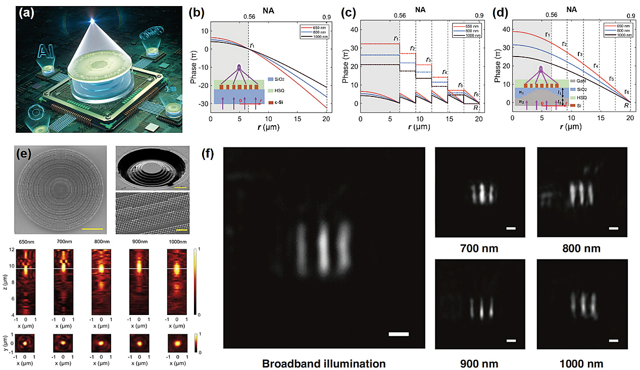 王雪华研究团队提出一种全新的超构原子区分复用方法:利用台阶相位色散补偿层将平面透镜分成传播相位阶梯变化的不同区域,从而实现超构原子相位色散有限调控的区分复用。原理上,这种复用可以不断重复下去,从根本上解决了消色差平面透镜固有的“高大宽”不可兼得的长期困境。该研究为消色差平面透镜在光子集成芯片,生物医学成像、人工智能、自动驾驶、机器视觉等新兴领域的广泛应用扫清了障碍。