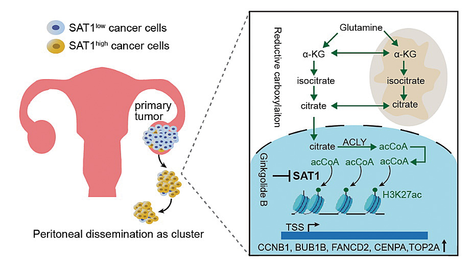 课题组研究发现,低氧诱导SAT1高表达,而SAT1通过促进肿瘤细胞非锚定生存,进而增强盆腹腔转移。SAT1高表达的癌细胞在恶性腹水中普遍存在。SAT1通过直接乙酰化有丝分裂关键调控基因的H3K27结构域,提升其转录水平,进而保护非锚定的转移细胞免于有丝分裂灾难与细胞死亡。SAT1对H3K27的乙酰化作用,依赖于谷氨酰胺通过还原羧化途径提供乙酰辅酶A。研究还发现,药食同源的天然产物银杏内酯B,可有效抑制SAT1活性,显著降低小鼠模型中的转移性肿瘤负荷。
