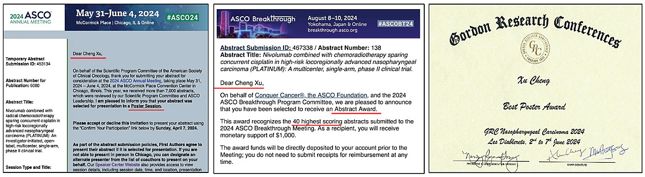研究入选2024年美国临床肿瘤学会(ASCO)大会壁报,并获得ASCO Breakthrough峰会摘要奖(Abstract Award,全球仅40项)、国际鼻咽癌Gordan大会(GRC)最佳壁报奖(Best Poster Award),得到国际同行认可。针对上述新疗法的一项多中心、随机对照、3期试验目前已完成,有望改写鼻咽癌治疗指南。