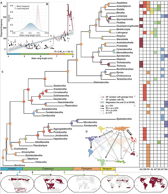 师超凡教授团队综合应用生态位模拟、系统发育分析、计算流体力学与历史生物地理重建等跨学科的理论与方法,揭示了脉翅目鳞蛉科(Berothidae)昆虫的适应性演化、扩散历史及其与地质环境变化的动态互作机制:鳞蛉通过生态位变化和飞行能力优化的双重策略,在1.7亿年间成功实现了对地球环境变迁的响应和地理分布格局的演变,展现了一个古老昆虫类群在地球上长期生存的智慧。