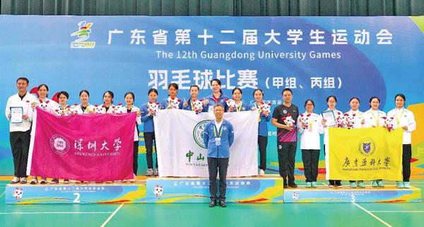 5月12日,广东省第十二届大学生运动会羽毛球比赛(甲组)在广东外语外贸大学落幕。本次比赛汇聚了来自全省的顶尖选手,包括华南理工大学、暨南大学、广东工业大学等高校的全国冠军队伍精英。中山大学派出10名选手(5男5女),参加了男子团体、女子团体、男子双打、女子单打和女子双打等5个项目的角逐。经过6天的激烈比拼,中山大学羽毛球队获2金2铜及1个第五名的优异成绩,并以显著优势夺得团体总分第一名。陈美桦、林卓言、翟相宜、钟玥和陈君婷组成的队伍勇夺女子团体冠军;陈美桦/林卓言组合斩获女双冠军;谢炜康/李泽宇获得男双季军;翟相宜同时摘得女单季军,展现了全面实力。