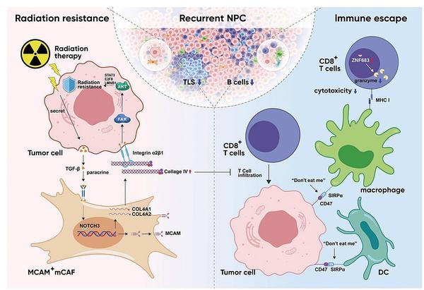 研究团队对24例患者的39个初治-复发配对组织样本行单细胞测序与空间转录组测序,解析初治-复发鼻咽癌肿瘤微环境差异。研究团队鉴定了与复发鼻咽癌放疗抵抗显著相关的肿瘤相关成纤维细胞亚群:MCAM+ 肌成纤维细胞(MCAM+ myCAFs)。分子机制研究发现,MCAM+ myCAFs通过分泌IV型胶原与肿瘤细胞表面ITGA2结合并激活FAK-PI3K-AKT信号轴,进一步,调控DNA损伤修复的核内特异转录因子,增强肿瘤细胞辐射抵抗。此外,IV型胶原能显著抑制T细胞浸润,导致肿瘤细胞免疫逃逸发生。相反,肿瘤细胞在接受辐照后,会释放大量炎症因子TGF-β,诱导并维持MCAM+ myCAFs的表型和功能维持。