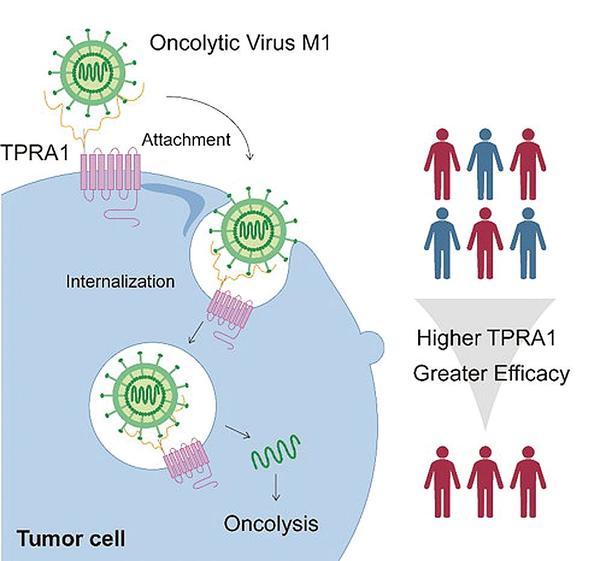 近日,中山大学中山医学院颜光美梁剑开团队在该领域取得重要突破。研究通过膜蛋白CRISPR-Cas9筛选系统,首次鉴定G蛋白偶联受体TPRA1为溶瘤病毒M1的新型受体及疗效预测生物标志物。相关成果发布于期刊《Advanced Science》(《先进科学》)。