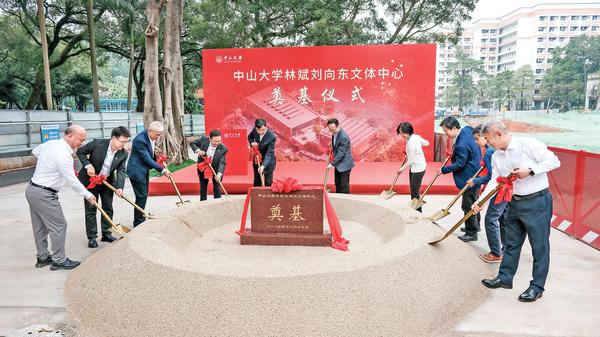 奠基仪式在南校园英东体育中心东侧草坪启动。刘承功代表学校向林斌校友一行表示热烈欢迎与衷心感谢,并表示中山大学的百年发展凝聚着广大校友的鼎力支持。林斌、刘向东校友伉俪长期心系母校,从设立奖学金到捐建文体中心,持续助力学校育人事业,以实际行动诠释了对母校的深厚情谊。他强调,体育事业承载着国家强盛、民族振兴的梦想,文体中心的建设彰显了大学育人责任,将激励一代又一代中大学子勇往直前、不断超越。