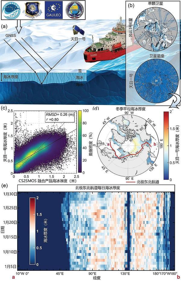本报讯(通讯员/曹宁)近日,中山大学联合航天天目(重庆)卫星科技有限公司、国家卫星气象中心,依托我国自主构建的天目一号GNSS-R卫星星座(在轨22颗),在北极海冰监测领域取得重大突破,首次实现了对北极海冰厚度的逐日、高精度监测,能为极地航道冰情保障提供关键数据支撑。上述研究近期发表在《Science Bulletin》。文章第一作者为中山大学遥感科学与技术学院硕士研究生黎源,通讯作者为中山大学程晓教授和郑雷教授。