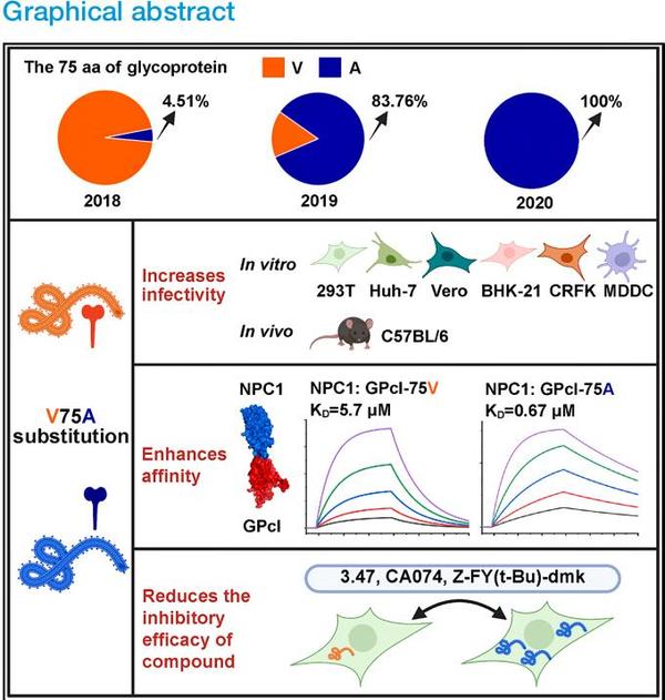 为验证其生物学效应,团队利用多种实验模型开展研究,结果表明该突变能显著增强EBOV对多种宿主细胞及小鼠的感染能力。机制研究发现,该突变通过稳定蛋白构象增强GP与病毒受体NPC1的结合,同时降低病毒进入细胞时对宿主组织蛋白酶的依赖。此外,研究还发现该突变能够削弱部分现有治疗性抗体及小分子进入抑制剂的抗病毒效果,提示GP-V75A突变可能带来耐药风险。