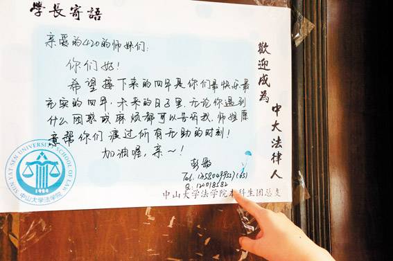 ◎法学院流传着这么一句话:“有事找学长”。有问题不再是百度一下,而是学长一下,学长在中大法学人心目中拥有着不同的含义,这词散发着正能量。